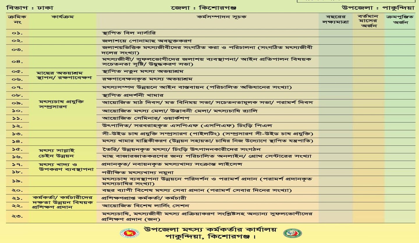 | ২ | মৎস্য চাষ বিষয়ক বিষয় ভিত্তিক প্রশিক্ষণ/মত বিনিময় সভা আয়োজনের মাধ্যমে সম্প্রসারণ সেবা প্রদান। | মৎস্য চাষী/উদ্যোক্তা | অফিস সময়ে |